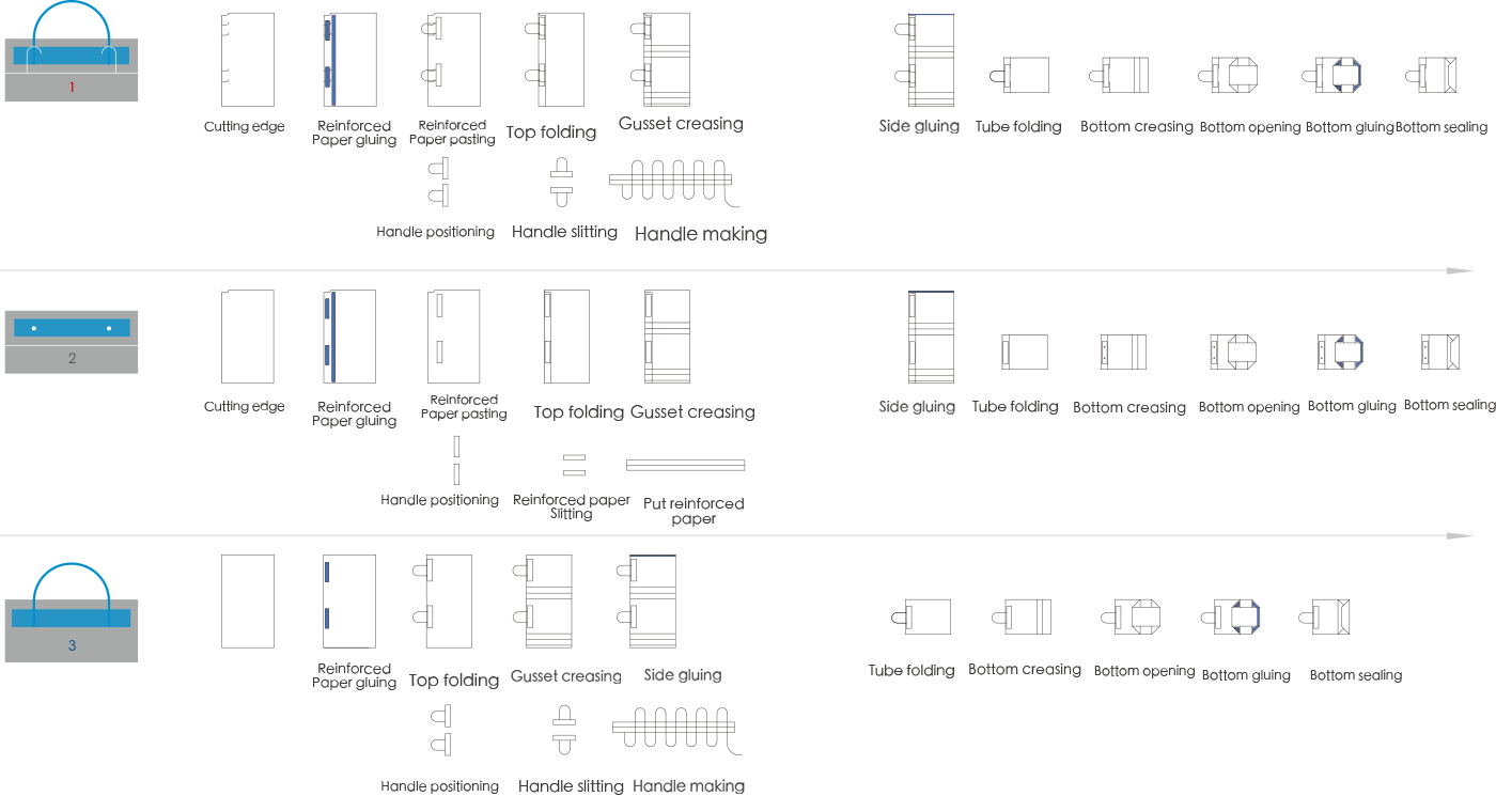 1.Paper handle making、handle pasting、top folding、tube forming、gusset forming、 square bottom open、bottom gluing、bottom pasting、compaction output.